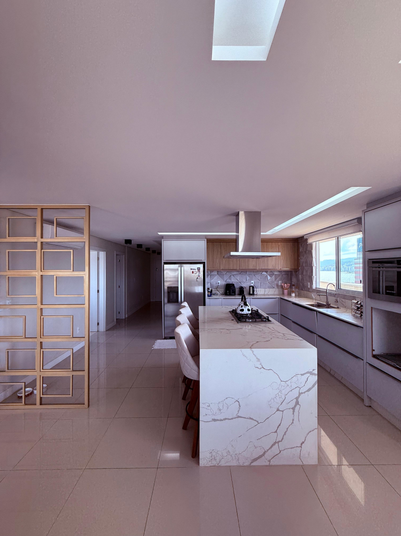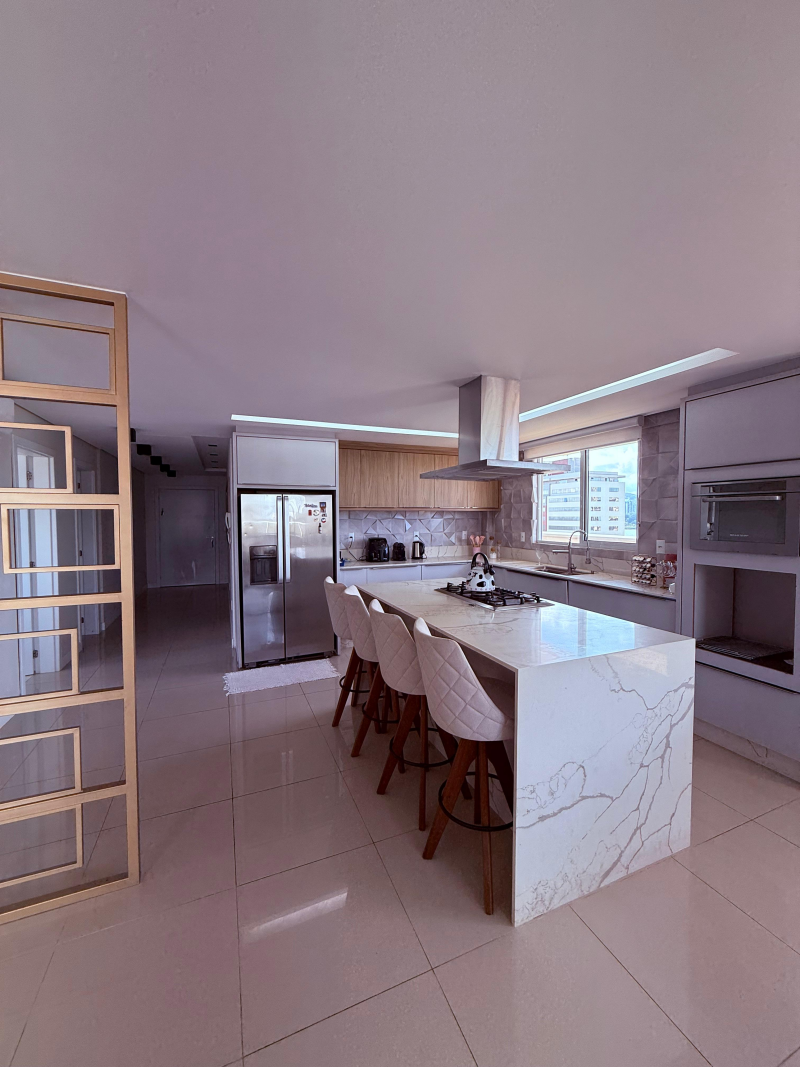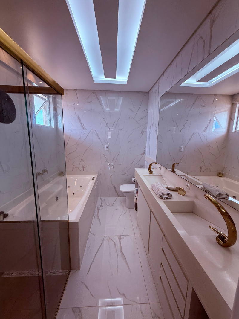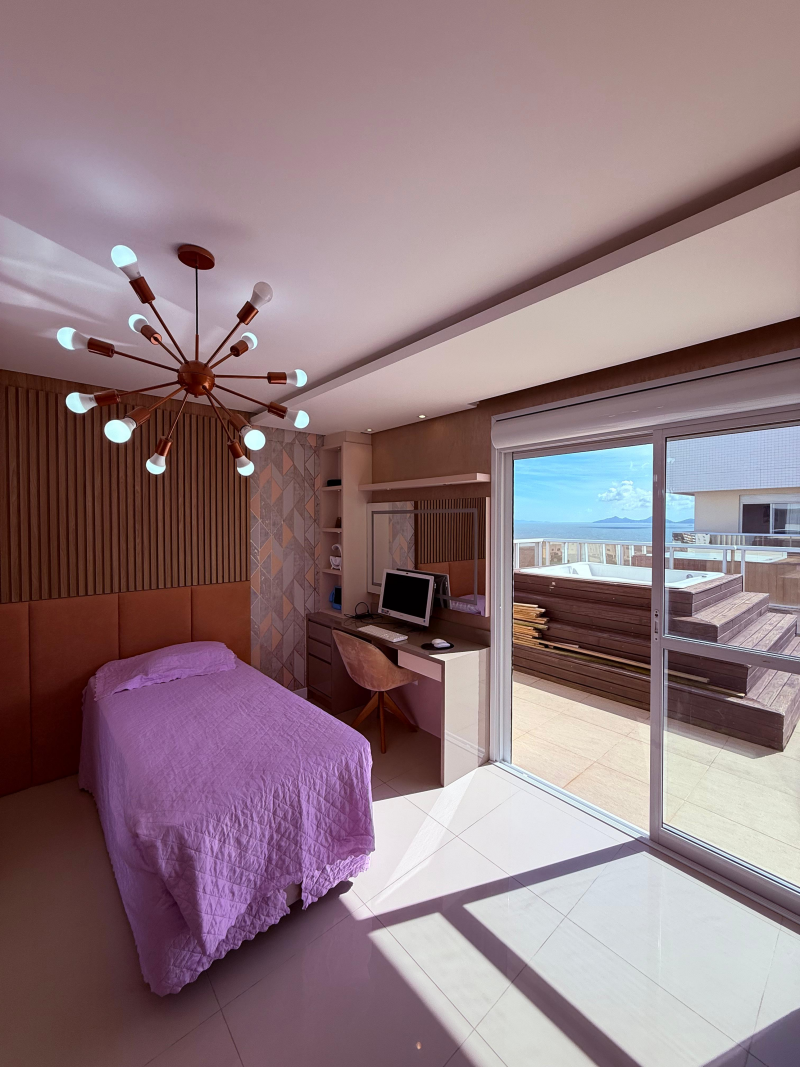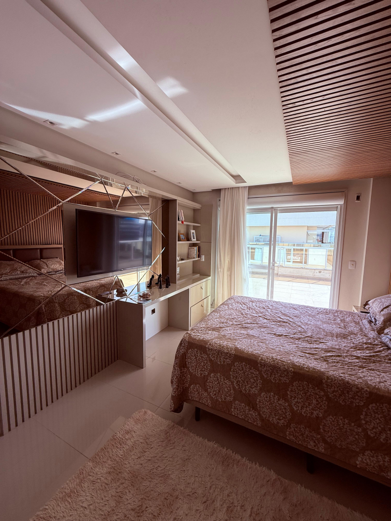 Sendo 01 suíte master + 02 suítes, sala integrada com cozinha, lavanderia, lavabo, 02 ofurôs, sendo um deles de frente para o mar e 04 vagas de garagem com 02 hobby box.